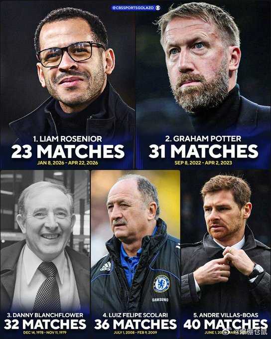 【罗塞尼尔仅仅执教切尔西23场比赛!】他成为切尔西正式主教练里执教场次最少的!